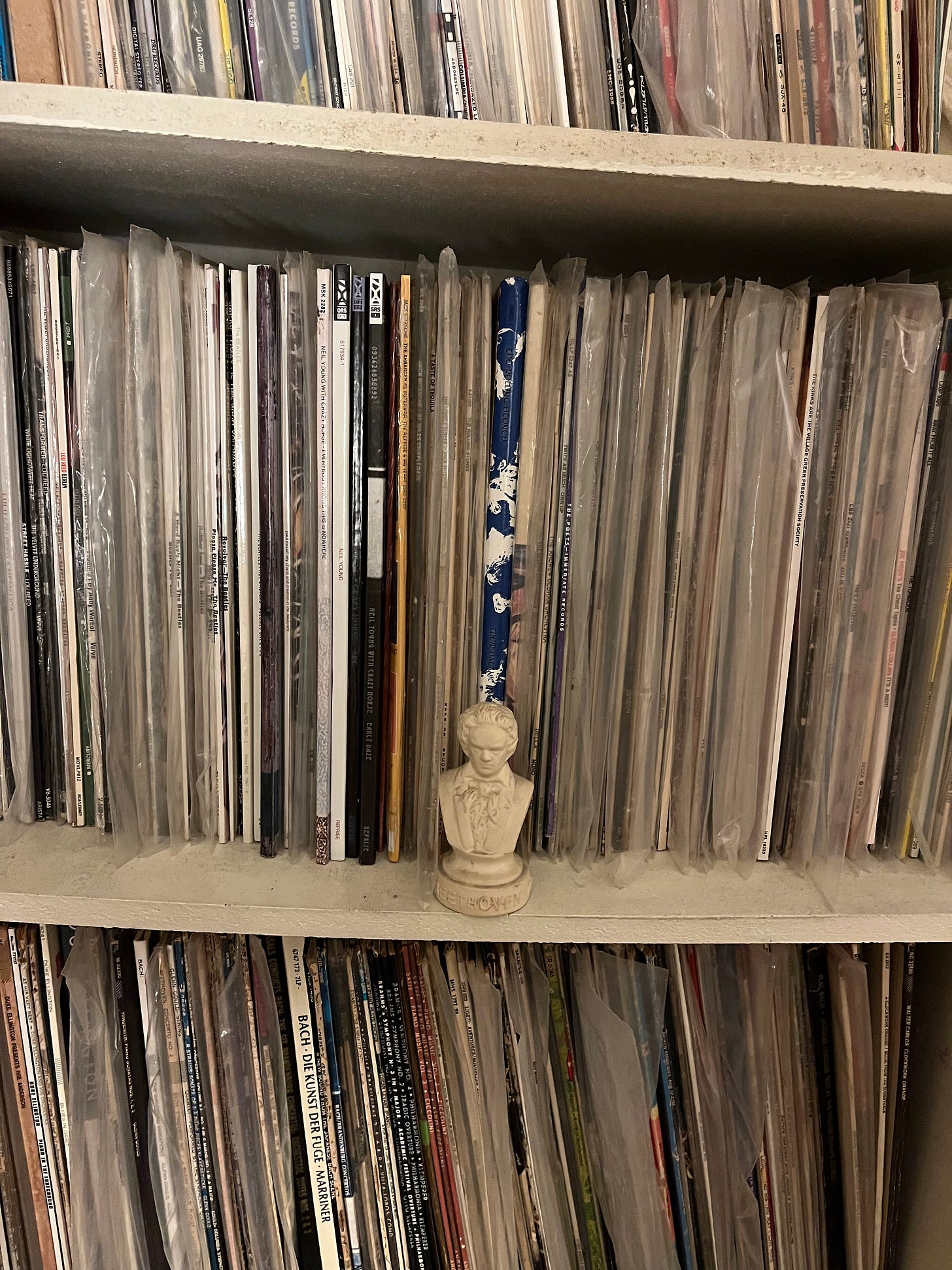 I surveyed my music collection and divided it into different mediums: 12” LPS (1,646), 10” vinyl (61), 7” 45 rpm (300), CDs (1,104), and five music-oriented DVDs. Thus, I have 3,116 pieces of music. I also listen to streaming music, but I’m not including that in the equation. I want to tell you that I play album after album, but the truth is that days can go by without using my turntable or streaming services. Still, listening to music is probably the most essential activity in my life. I don’t need to play a record daily, but I need to see my records on shelves or under the stereo system daily.