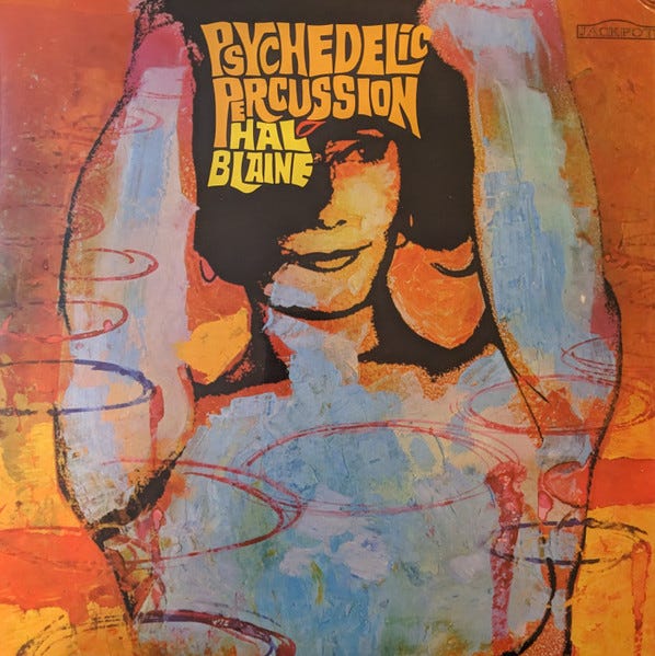 Psychedelic Percussion is an oddity in that it is an album put together by one of the great in-studio drummers in America at the time. The drum riff in Be My Baby is one of the great singular pieces of drum identification that leads to the greatness of Hal Blaine. Under the supervising eyes and ears of such talent as Phil Spector and Brian Wilson, Blaine was an essential part of the group recording sound of so many outstanding records. The early solo albums he made in the 1960s are of interest, and I do like his “Hot Rod” album Deuces, "T's," Roadsters & Drums, which is not unusual and pretty much a straightforward Car orientated album, but with his talents as well as the producer Lee Hazlewood. No, what is really interesting is Psychedelic Percussion.