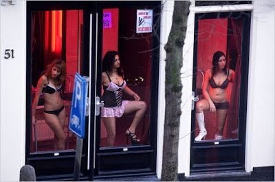 There is an area in Amsterdam that is their red light district. It's the oldest street in Amsterdam and it is called The Warmoesstraat (Warmoes street). Walking down this street is like a girl market, where all the whores are placed in windows. Since I'm a shy fellow, I have a hard time making direct eye-contact with the woman placed in the open windows - but they for sure try to make eye-contact with the walker. Or, as you stroll by, they knock on the window to get your full attention.