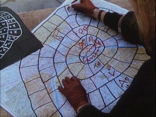 In the film, Marie and Baptiste play Jeu de l'oie (Game of the Goose), the earliest board game played (at least in the movie) on the map of Paris. It’s a game of chance rather than skill and a device for moving the narration in a particular direction. The Game of the Goose is set as a spiral, with 63 numbered spaces, and the goal for the winner is to reach space 63. The game came to be known in the 16th century, originally from Francesco de’ Medici to King Philip II of Spain. The map in the film is significant because the Bulle Ogier character sees a pattern hand-drawn on the map discovered in her lover’s (Pierre Clemente) briefcase, who may be a common criminal or even a terrorist.