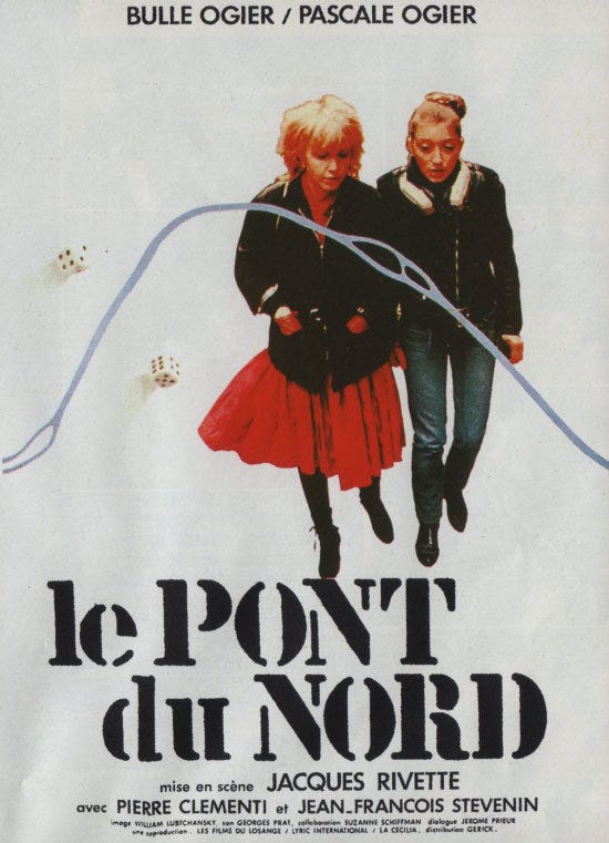 Le Pont du Nord is terrific! Rivette is one of my favorite filmmakers, and among his pictures Celine and Julie Go Boating is the one I like best (available to view on the Criterion Channel, all 3 plus hours.) His Secret Defense is his Hitchcock movie, but rather than recycle Hitchcock tropes, it plays like a ceremonial commentary on Hitchcock movies. All of his films are worth seeing.