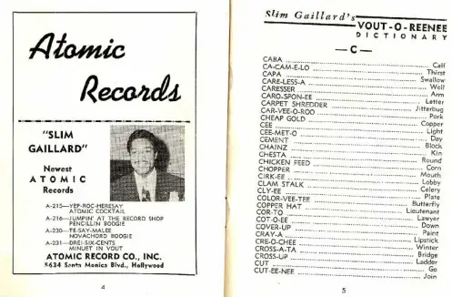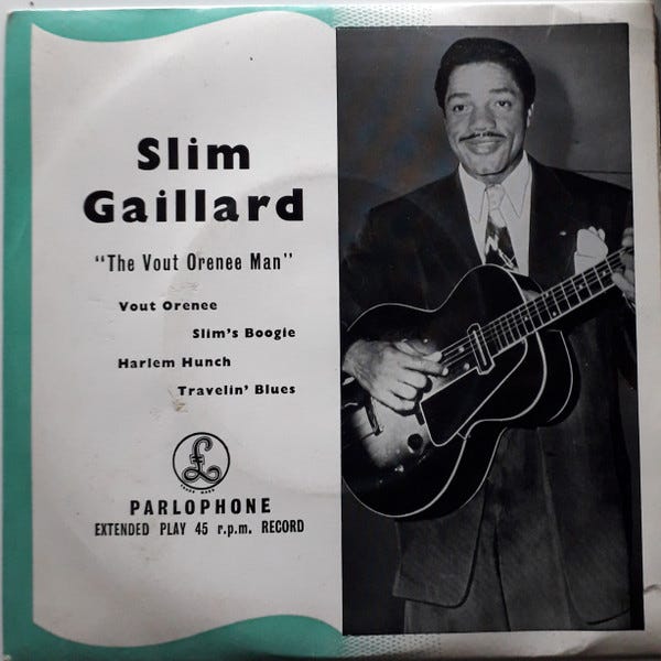 Less known but equally important is Slim Gaillard, a Swing-era Jazz guitarist, and pianist who merged into the BeBop world with Dizzy and Charlie Parker playing in his combo. Through my amateur studies of Parker, I discovered Gaillard’s music, which is terrific, but his lyrics are really something. Gaillard invented his language, Vout-o-Reenee, and wrote a dictionary. Since Lord Buckley has already combined the British touch with Jive, I’ll try to work on making it happen in my everyday existence.