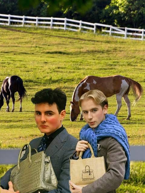 The other obsession I have since I got sick is “Angelllboys” on Instagram. They are a total mystery to me, and I think they are the closest thing to a Gilbert and George of the 21st century. While I was brain-dead scrolling Instagram for food, I came upon them shopping for chocolate at the most expensive candy shop in London. They very much look like AI human figures doing a version of Oscar Wilde’s The Picture of Dorian Gray, taking place in the lobby of a very expensive hotel. There is a “let them eat cake” approach to life here, with the thought that being a dandy may be the most dangerous position in this sad and sorry world. Whether they are real or fake doesn’t matter to me; it’s the surface image that I like a lot.